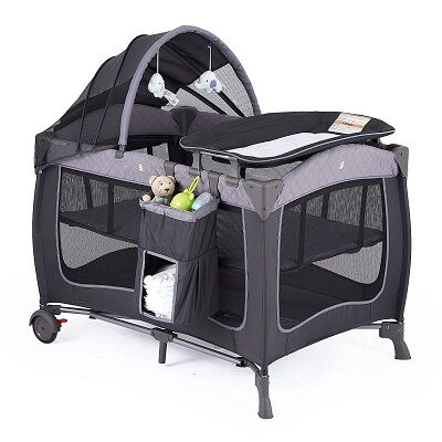 The Pamo Babe portable playard will provide you convenient and pragmatic place for baby’s sleeping and playing. The playard includes a removable full bassinet, changing table, storage bag and a detachable canopy. Easy locking mechanism makes the playard stable and it can be moved from place to place with large wheels and secured with brakes. Also included is a convenient travel tote bag.